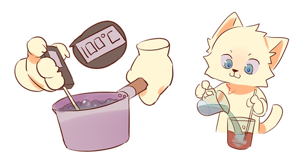 ③ゼラチン粉末を90℃以上のお湯に入れ、よくかき混ぜます。
