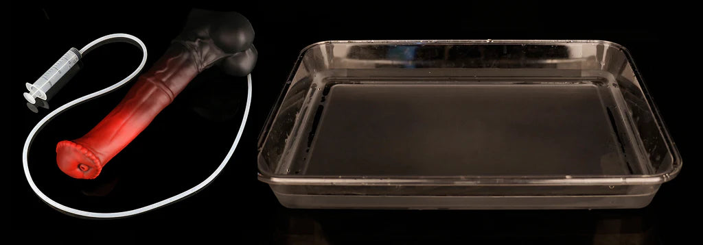 ①清潔剤(ぬるま湯にハンドソープまたはボディシャンプーを混ぜた液体)をのせた皿、Nothosaurの射精ディルド、付属された注射器を用意します。詳しくは【導管付きの製品について】をご確認ください。