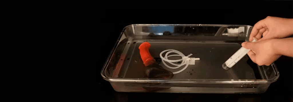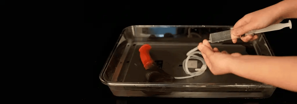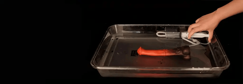 ⑤清潔剤の代わりに清潔な流水でディルドの表面を洗浄してから注射器で清潔な水を吸い上げ、導管に注入して洗浄します。この操作を2〜3回繰り返すことで、きれいに清潔できます。